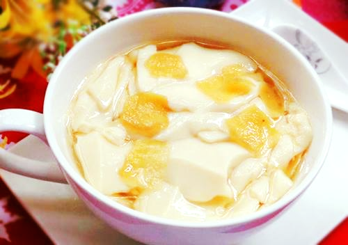 'Tao pho' (sweet tofu pudding) is a very common and popular sweet dessert made from soy beans. Tofu pudding has the smooth, creamy texture of a light flan, but the taste of soy milk. The texture of silken tofu is very similar to custard, but without the calories