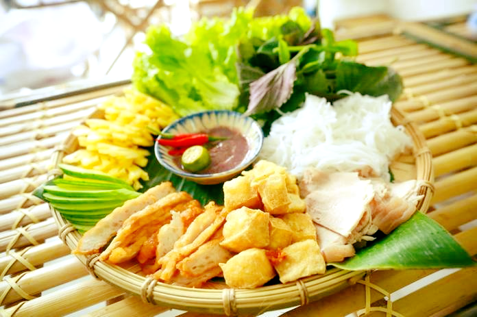 The fermentation may take from six months to one year before mắm tôm can be served, normally with “nộm” sweet and sour grated “rau muống” water morning glory, “cà pháo” egg-plants, “thịt chó” dog meat and of course, “bún đậu mắm tôm”. You can surely guess, “bún đậu mắm tôm” includes noodles “bún”, tofu “đậu”, shrimp paste “mắm tôm” and, last but not least, odoriferous herbs “rau thơm”, which is optional but they will make the difference. “Rau thơm” can be basil “rau húng” or cockscomb mint “kinh giới”.